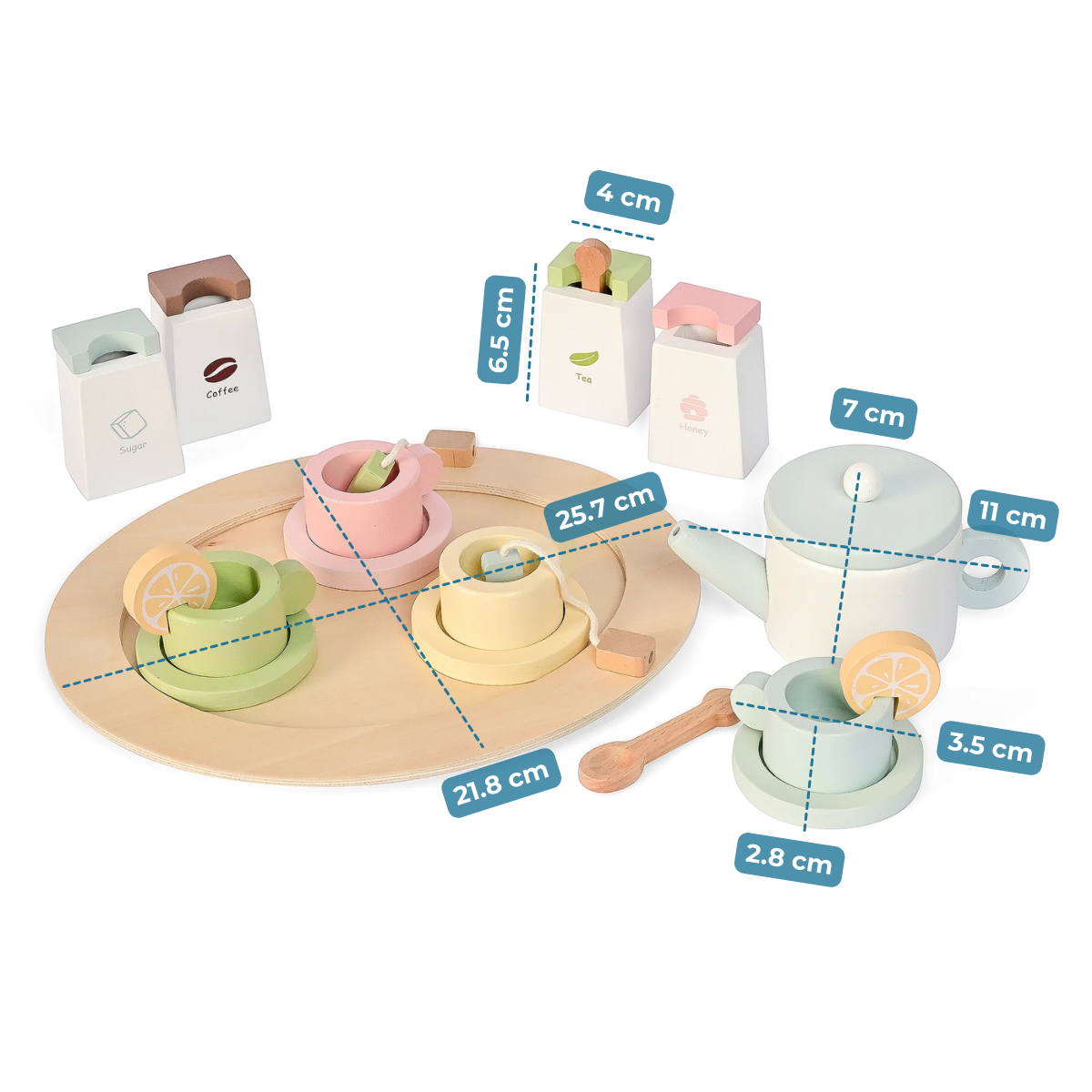The modern and stylish design makes this wooden tea party set a delightful addition to any playroom or pretend kitchen. It's perfect for role-play, creative play, and early learning while encouraging kids to share, imagine, and bond with others.